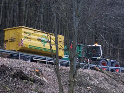 Von selbstfahrenden Raupenhäckslern über Anbaugeräte an Schleppern bis hin zu Großhackern – wir verfügen über die passende Technik für jedes Projekt. - Abtransport des Häckselgutes: